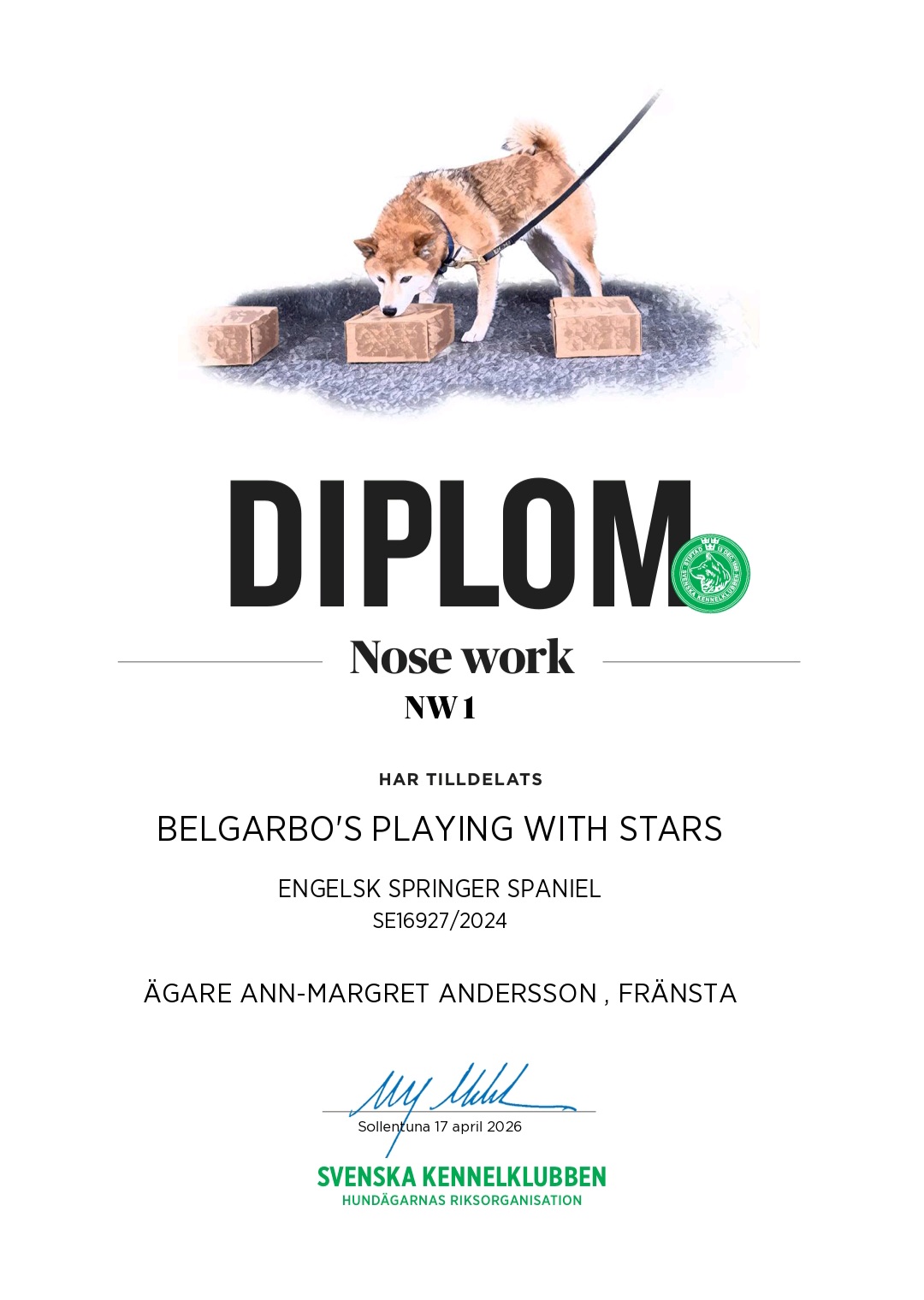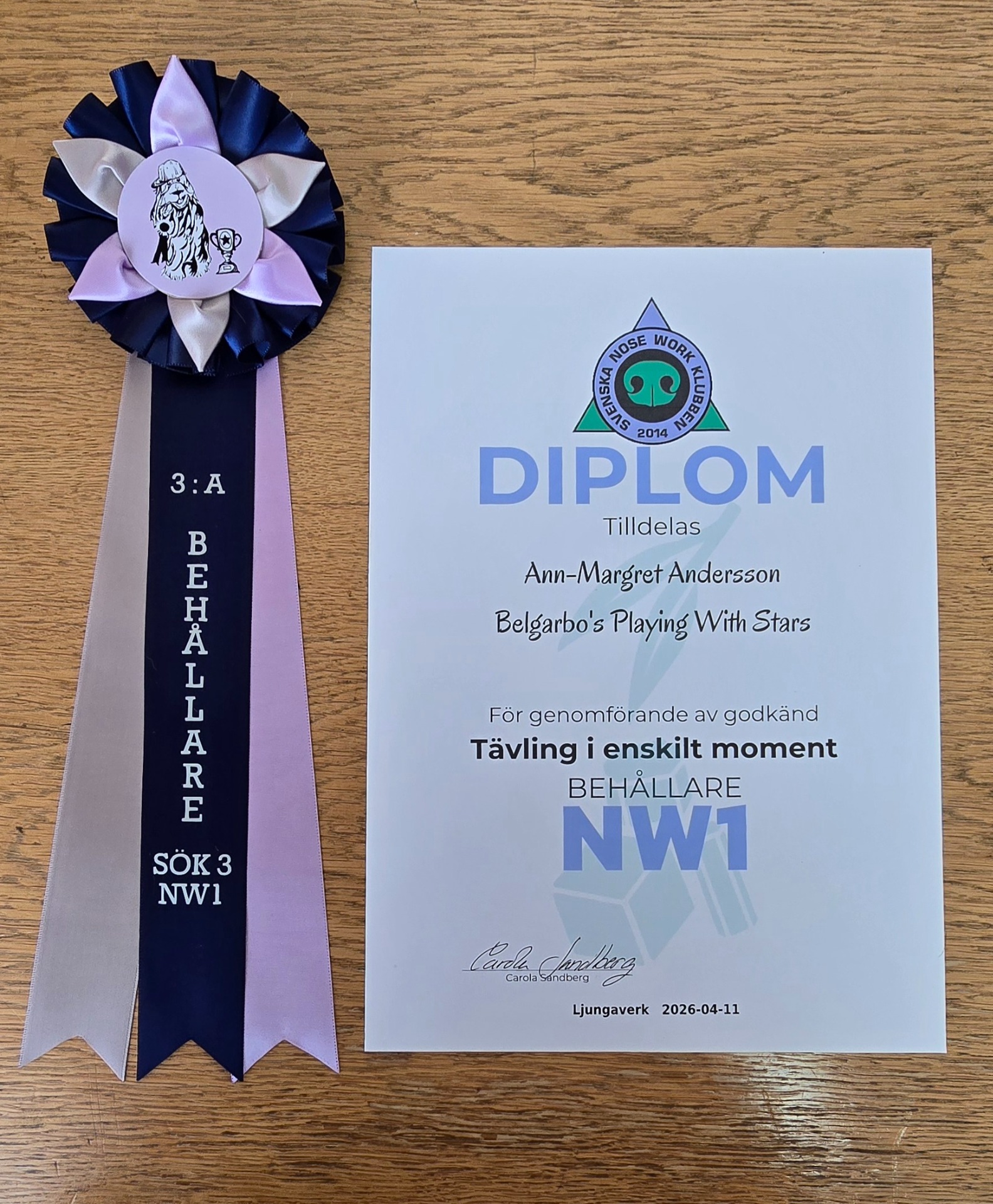 Norton (Belgarbo's Playing With Stars) fick sitt första godkända championat i NW1 samt nytt Diplom och en 3:e placering i sök 3 i behållar tävling i Ljungaverk.